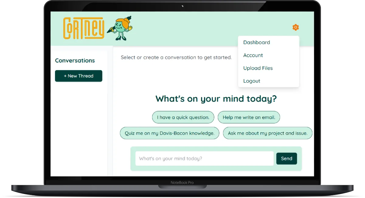If you’re not sure what to ask, CORTney gives you quick-start options like “I have a quick question,” “Help me write an email,” “Quiz me on my Davis-Bacon knowledge,” or “Ask me about my project and issue.”